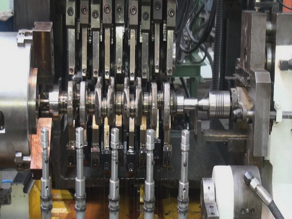 3.滾壓四缸機曲軸:滑臺橫向進給,九個夾鉗油缸通過滾壓頭分別夾緊工件上各自對應的主軸頸和連桿頸,此時潤滑油開。滾壓時九個夾鉗油缸按預定壓力進行加卸載,按設定滾壓圈數完成滾壓。滾壓完成后滾壓裝置退出。